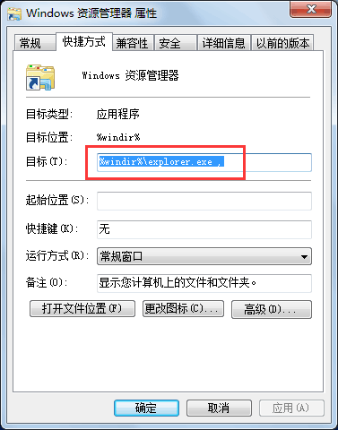%windir%\explorer.exe改为%windir%\explorer.exe ,,即加上一个空格一个逗号。