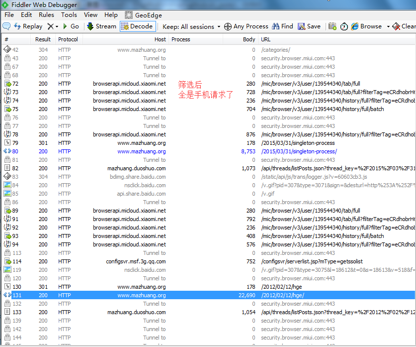 在开发/测试过程中有多台设备(PC/手机/模拟器)通过 Fiddler 代理上网时,如何方便地从满屏纷飞的 Session 中筛选出自己关心的那台设备的请求?